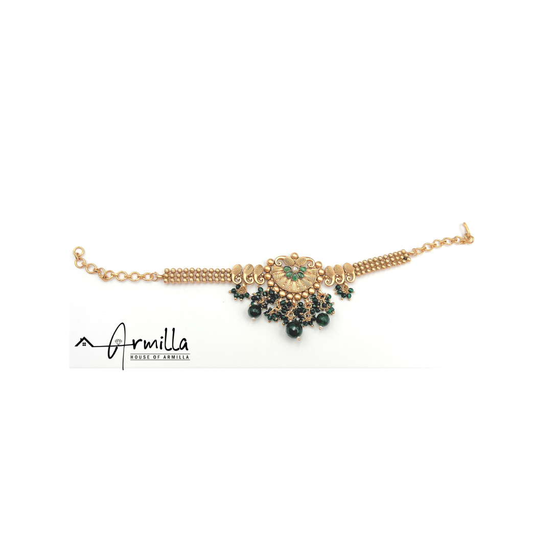 Introducing our stunning antique gold bridal set, perfect for the bride who wants a unique and timeless look on her special day. Crafted with the utmost care and attention to detail, this set is truly one of a kind.
