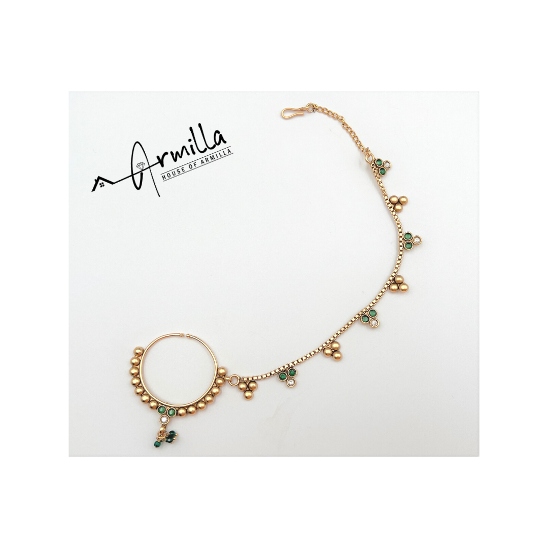 The set includes a choker, a long rani haar, a pair of matching earrings, maang tikka with maatha pati (head band), hand rings with chain (haathful), nose ring (Nath) and an arm band (baju bandh).