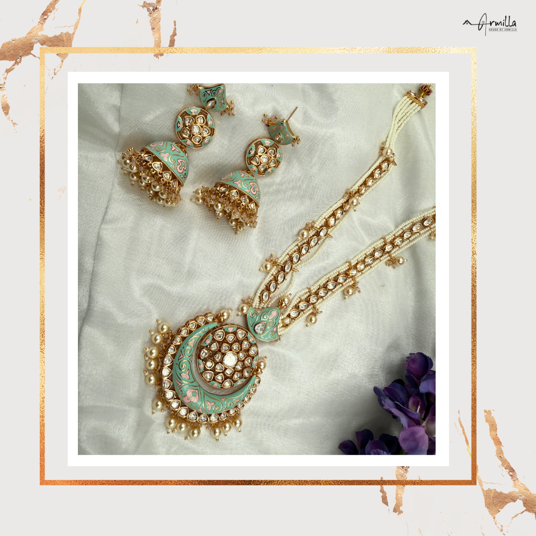 A fusion of elegance and artistry, this exquisite Green Enameled Kundan Set radiates timeless beauty. The crescent-shaped pendant, adorned with uncut Polki diamonds and intricate pastel enamel detailing, is gracefully complemented by delicate pearl drops. Paired with matching Jhumka earrings, this handcrafted masterpiece is perfect for weddings, festive occasions, and heritage-inspired ensembles. A statement of tradition with a modern touch.