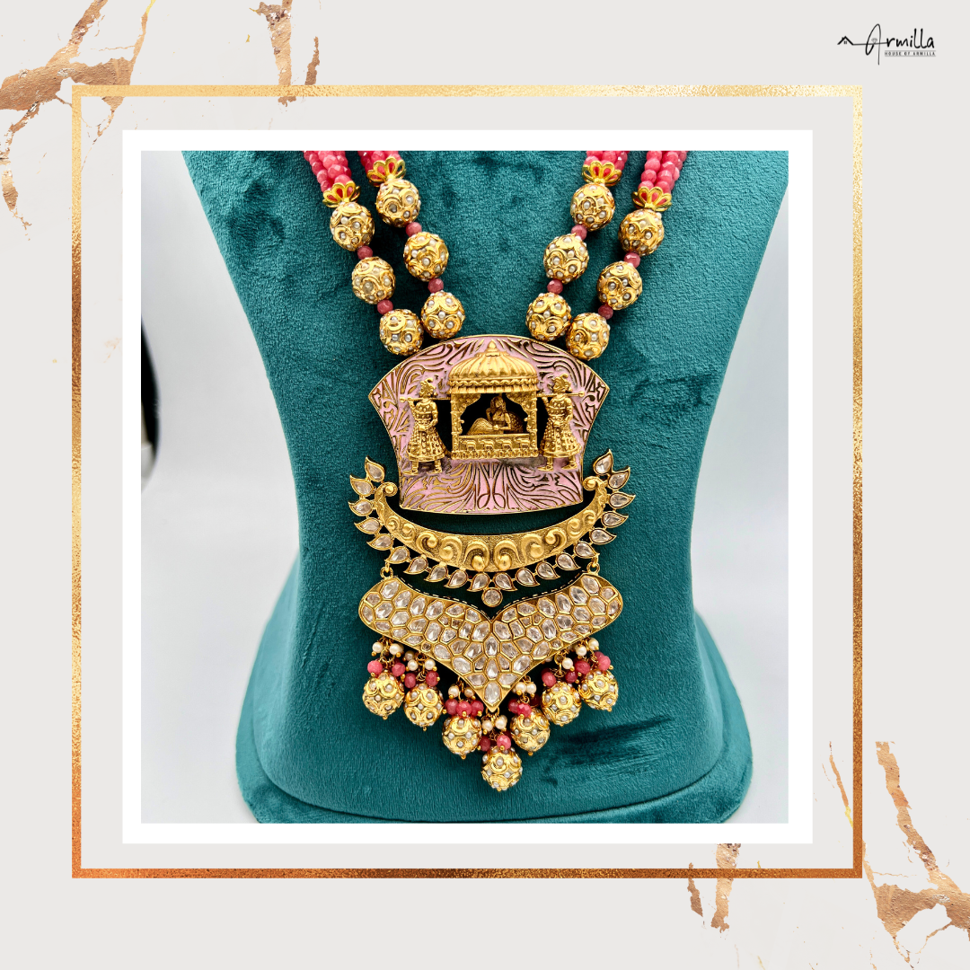 Experience the grandeur of heritage craftsmanship with this mesmerizing Temple Jewelry set. Adorned with intricate deity motifs, shimmering Kundan work, and hand-etched pink Meenakari detailing, this masterpiece embodies divinity and regality. The striking combination of pearls and deep pink beads adds an ethereal charm, making it an impeccable choice for weddings, festive occasions, and traditional celebrations. The matching earrings complete the look with a touch of opulence.