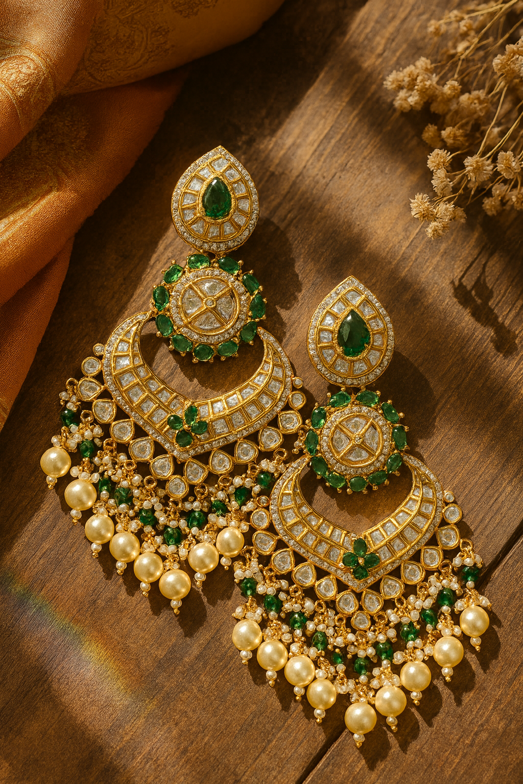 A pair of luxurious chandelier-style Kundan Polki earrings adorned with dazzling uncut diamonds, rich green emerald accents, and clusters of lustrous pearls. The intricate craftsmanship highlights traditional Indian artistry, with a teardrop-shaped emerald centerpiece, floral motifs, and layered pearl drops that exude regal charm. Perfect for weddings and festive occasions, these statement earrings combine timeless elegance with opulent detail.
