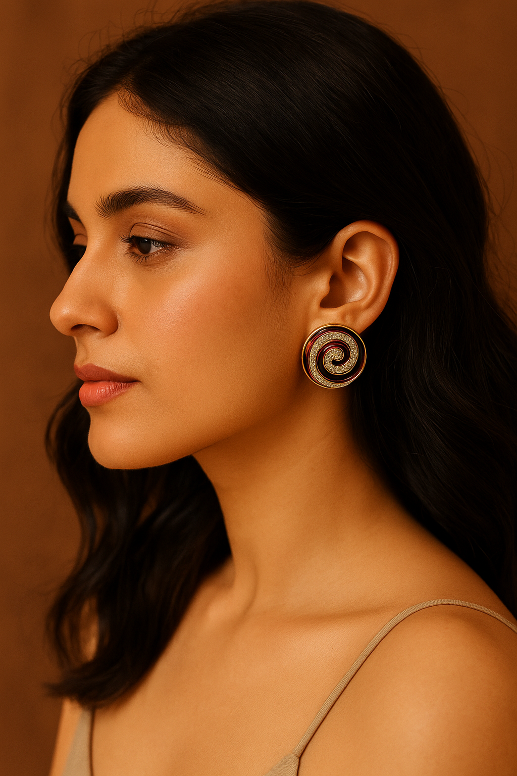 A bold pair of round stud earrings featuring an elegant spiral design, adorned with sparkling pave-set diamonds. The swirl pattern combines deep black and rich crimson enamel, framed in a luxurious gold-tone finish, creating a striking balance between contemporary glamour and timeless sophistication. Photographed on a polished white marble surface with subtle rainbow light reflections, these earrings exude high-end allure—perfect for evening wear or statement styling.