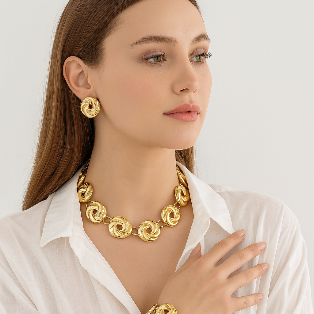 Twist Motif Necklace & Earrings Set: Interlinked swirl discs creating a harmonious, polished look—paired with matching earrings for a coordinated ensemble.