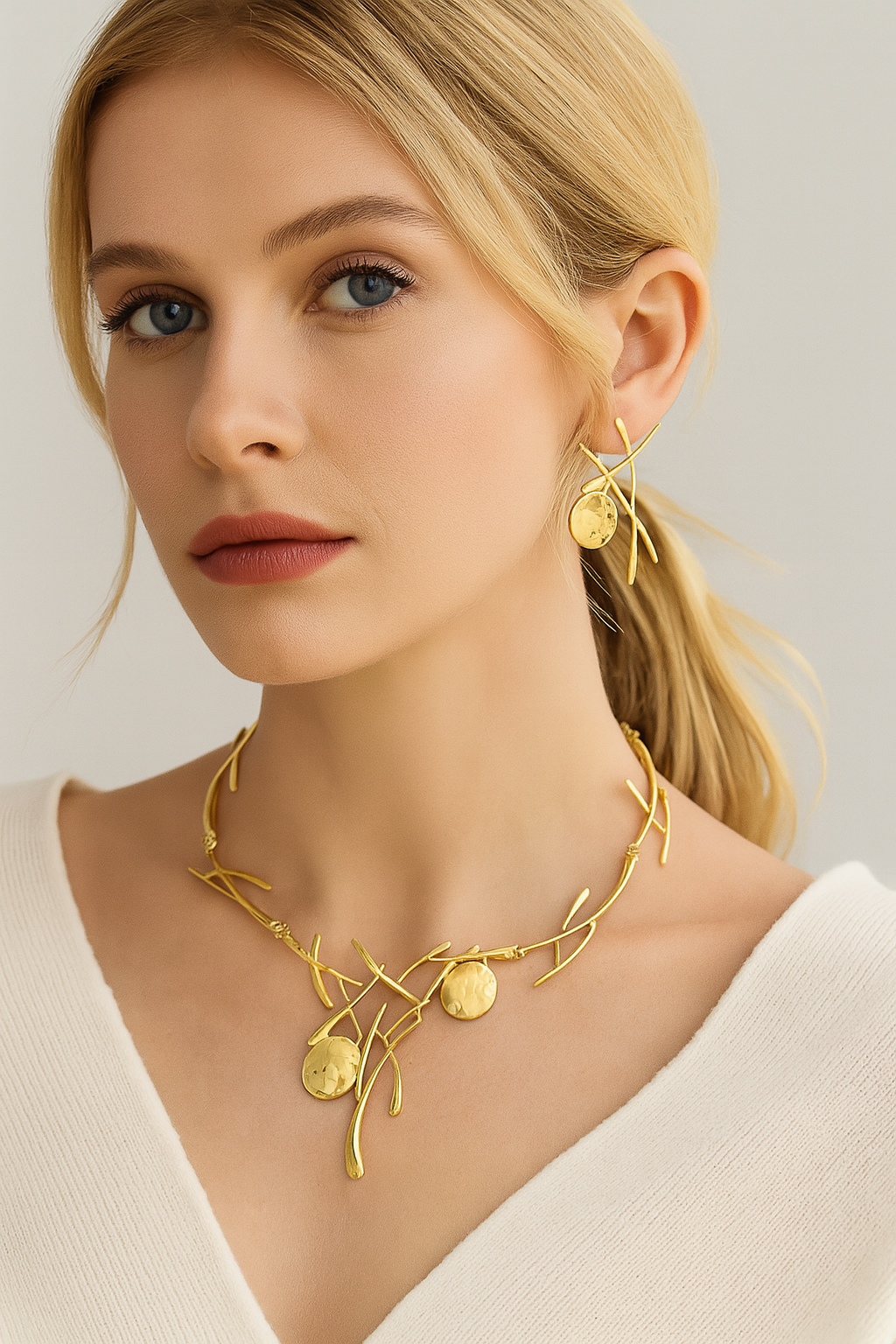 Nature-Inspired Abstract Necklace: Delicate branch-like gold elements accented with hammered medallions, capturing a refined organic charm.
