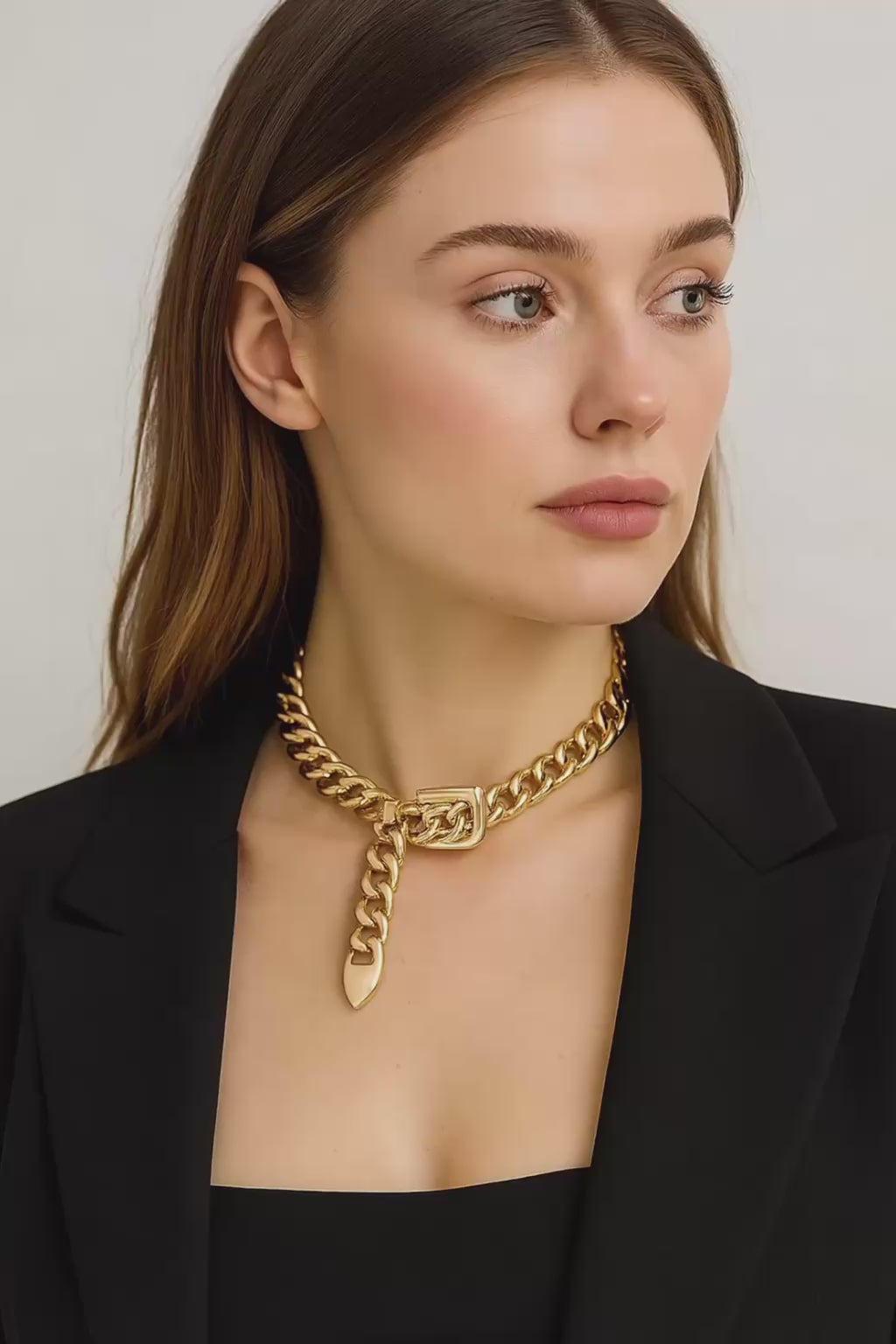 Chunky Chain Collar: Bold curb-link chain with a buckle-inspired clasp, perfect for power dressing and modern minimalism.