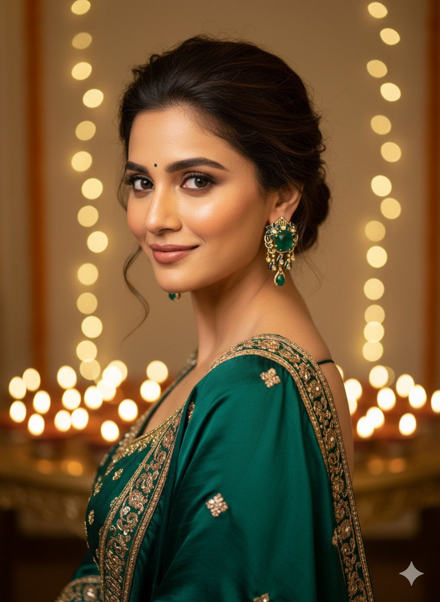 Exuding royal opulence and timeless artistry, these statement chandelier earrings feature magnificent emerald-green gemstones framed by intricate floral motifs in deep blue enamel and gold. The cascading tear-drop design, accentuated with delicate diamond detailing and pearl-like drops, evokes the splendor of traditional Indian craftsmanship. Perfect for grand celebrations, these earrings blend heritage allure with contemporary sophistication — a tribute to regal femininity and exquisite taste.