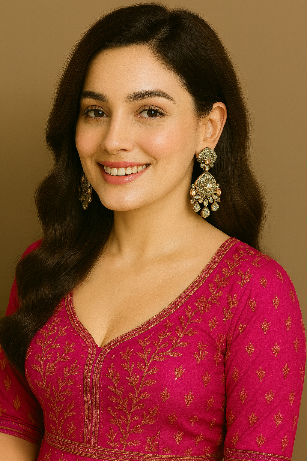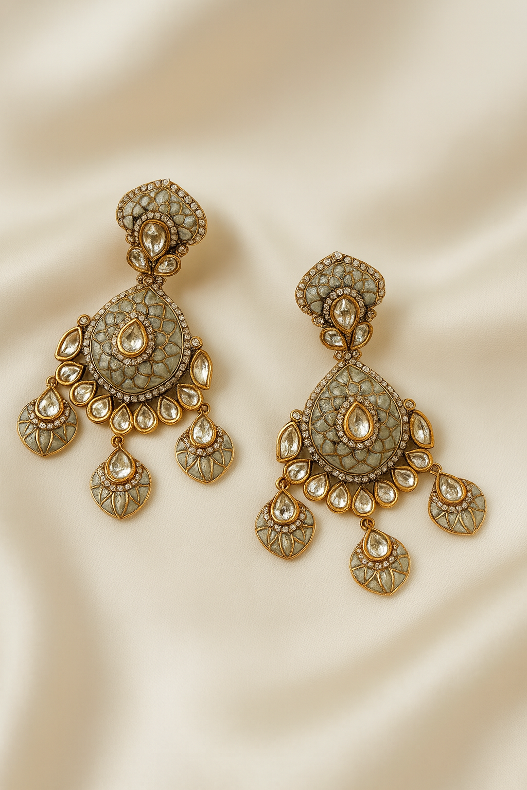 An opulent pair of chandelier earrings showcasing intricate meenakari work in a soft grey-blue hue, embellished with uncut Kundan stones set in a rich gold-tone frame. The design features a teardrop centerpiece surrounded by delicate floral motifs, accented with dangling Kundan drops for graceful movement. Photographed on a smooth champagne satin backdrop, these earrings exude royal charm—perfect for weddings, festive occasions, or statement traditional styling.