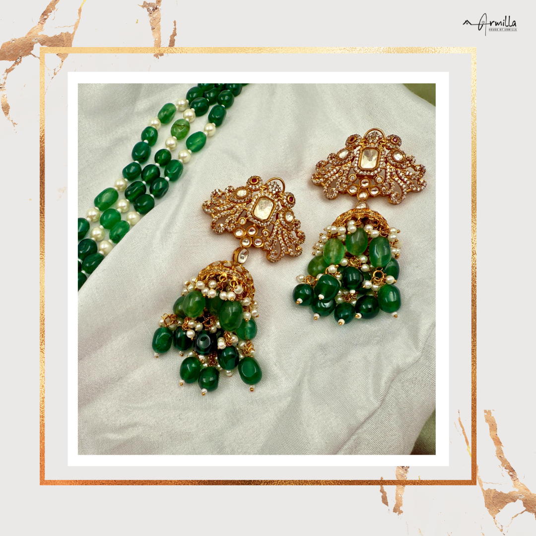 Drape yourself in the opulence of heritage with this breathtaking emerald-green Kundan necklace. Featuring a grand gold-polished pendant adorned with intricate detailing, uncut polki stones, and a striking green teardrop centerpiece, this masterpiece is paired with lush green gemstone strands and pearl accents for a regal touch. Perfect for weddings, festive occasions, and grand celebrations, this necklace radiates a royal charm that is both timeless and captivating. Elevate your ethnic ensemble with this exquisite blend of tradition and luxury!