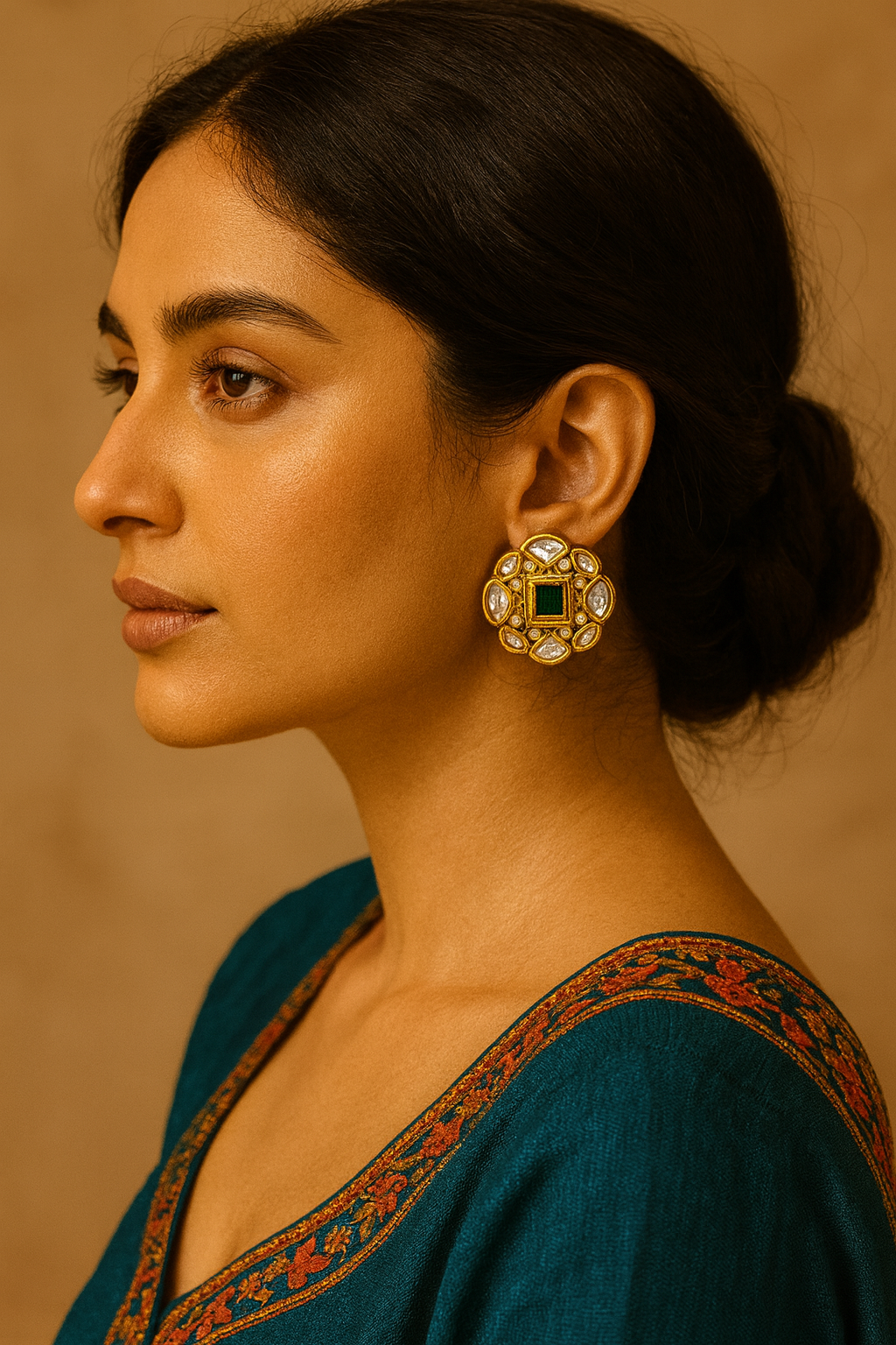 💚 A deep emerald-green center stone, symbolizing prosperity and elegance, framed by exquisite handcrafted Kundan petals.
