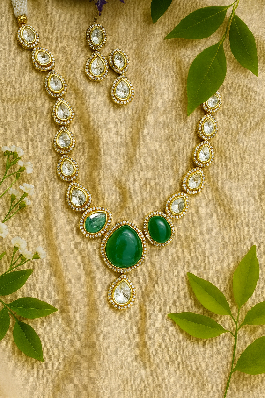 Elevate your elegance with this exquisite Kundan Polki necklace set, featuring dazzling uncut Polki stones delicately framed in gold-tone settings. The statement green gemstones add a regal touch, making this piece a perfect blend of traditional craftsmanship and contemporary grace. Paired with matching earrings, this set is ideal for weddings, festive occasions, and special celebrations. A true embodiment of heritage and luxury!