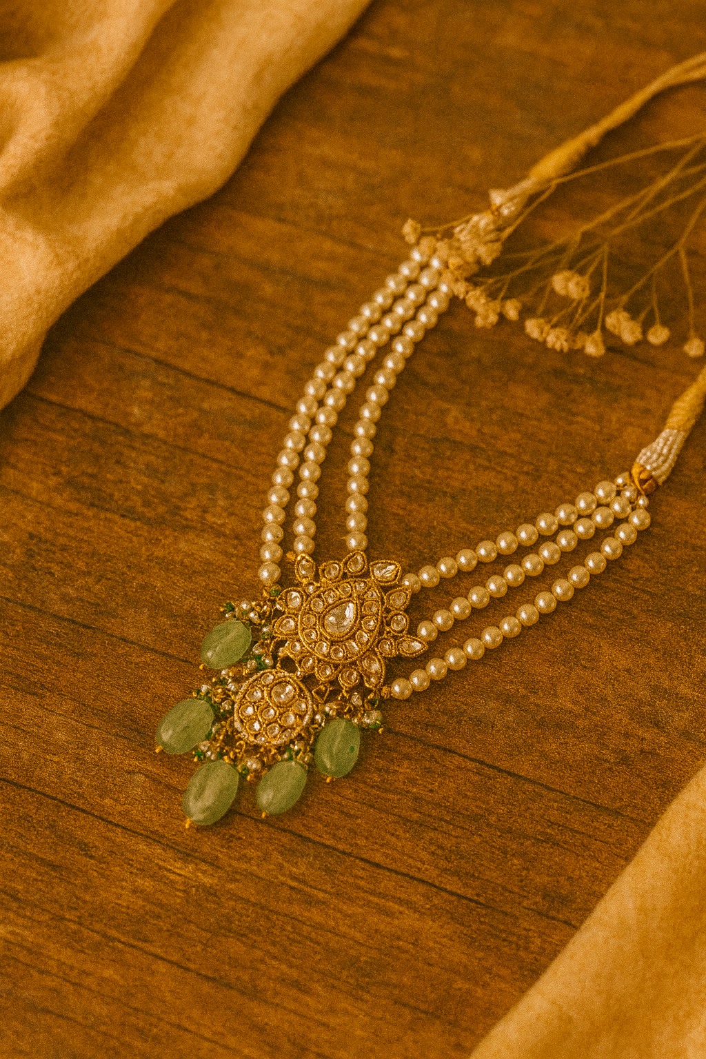 A timeless expression of elegance, this Pearl Kundan Choker Set is a blend of tradition and luxury. Featuring delicate rows of luminous pearls, intricate Kundan detailing, and exquisite green bead drops, this masterpiece radiates regal charm. The ornate floral-inspired motifs add an ethereal touch, making it a perfect choice for weddings, festive celebrations, and grand occasions. Paired with matching earrings, this set is designed to make a statement.