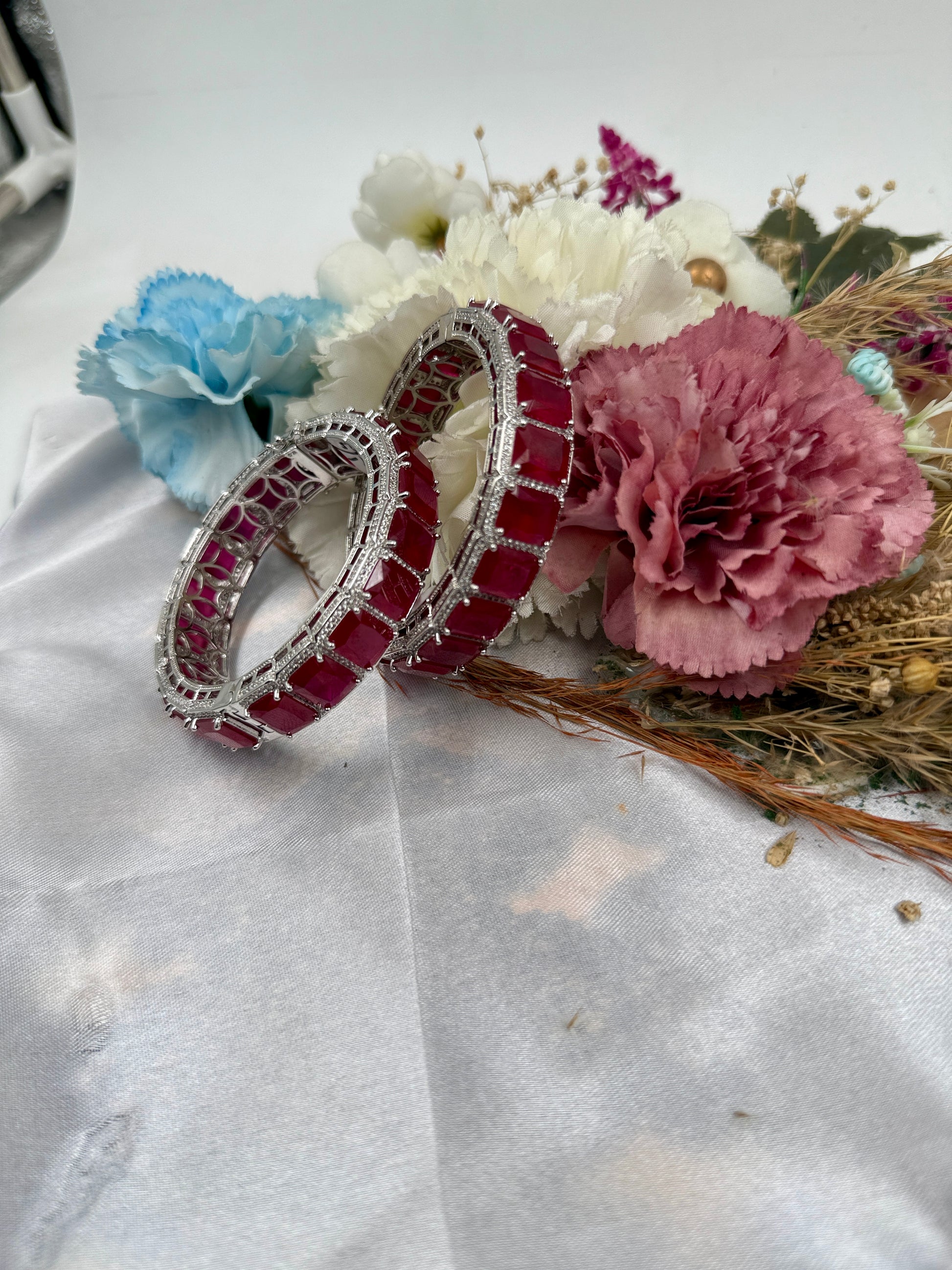 A striking blend of modern sophistication and timeless allure, these bangles are set with vivid square-cut ruby-red stones that radiate passion and elegance. Each stone is carefully bordered with fine detailing, creating a bold yet graceful design that shines beautifully against the silver framework.